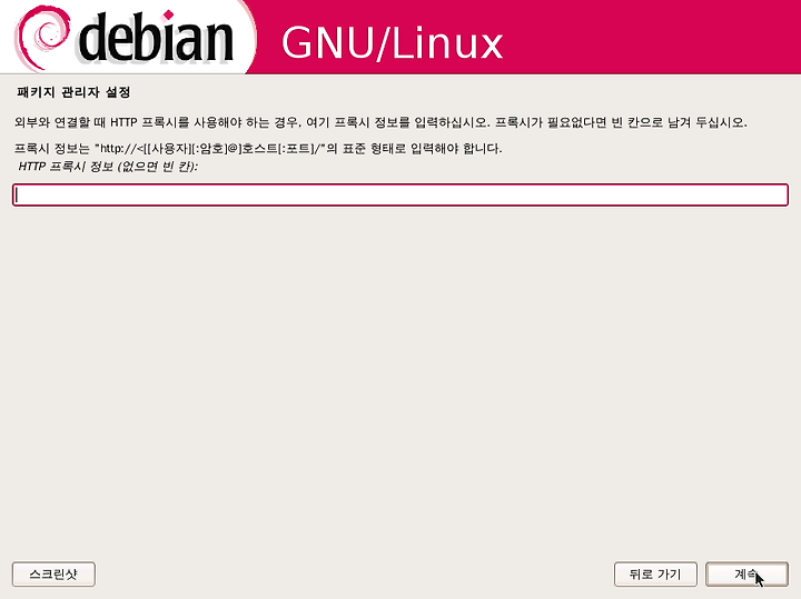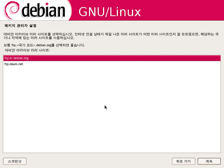 한국의 Debian 사이트와 Daum. 이렇게 두 개의 사이트가 있는데 내가 설치하는 서버에서 Daum과 속도가 원할하기 때문에 ftp.daum.net을 선택하고 다음으로 넘어간다.