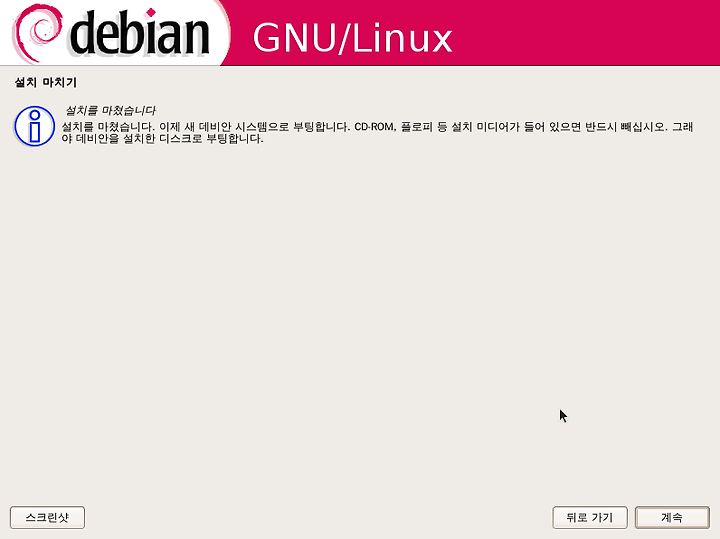 설치가 완료되면 CD-ROM에 CD를 제거하고 계속을 눌러서 재부팅 한다.