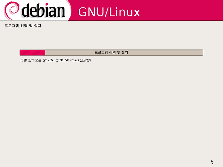 설치가 시작되는데 네트워크 인스톨이기 때문에 네트워크 선을 분리하는 일이 없도록 한다. 설치에 필요한 파일을 앞에서 설정한 ftp.daum.net에서 받아오고 있는 화면이다.