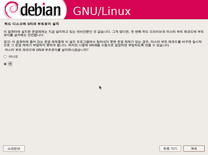 GRUB 부트로더를 설치 할 지 물어보는데 리눅스 외에 파티션을 나눠서 윈도우나 다른 OS를 설치 할 때 유용하게 사용 할 수 있는 부트로더이다. 부트로더가 설치되지 않으면 부팅이 안 될 수 있으니 기본 체크사항에서 다음으로 넘어간다.