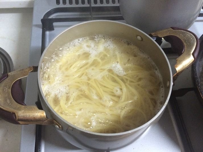 3> 끓는 물에 스파게티 면과 소금, 통후추를 넣고 8분간 끓인다.