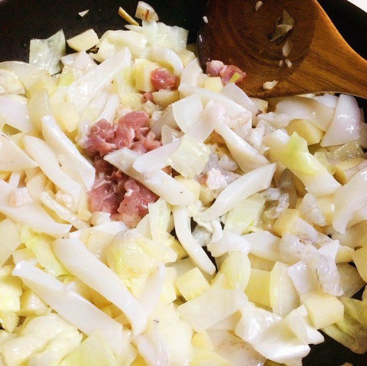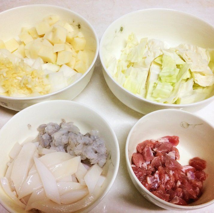 1> 돼지고기, 새우, 오징어, 감자, 양파, 양배추, 마늘을 잘게 썬다.
