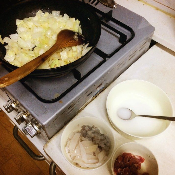 3> 양파와 양배추가 어느정도 볶아지면, 전분가루를 물에 타서 준비한다.