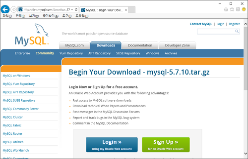 복사 된 링크 값 ( http://dev.mysql.com/get/Downloads/MySQL-5.7/mysql-5.7.10.tar.gz )