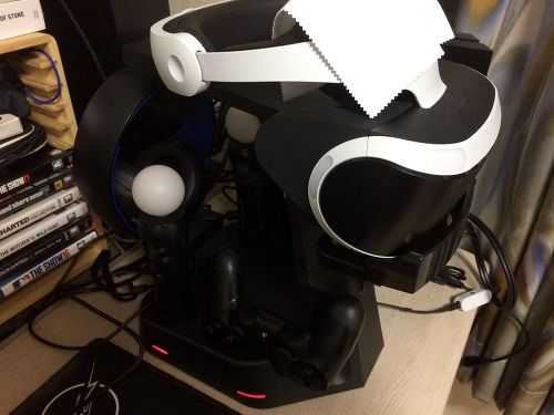 PS VR, 듀얼쇼크 2개, Move 컨트롤러 2개, 헤드셋까지 거치 및 충전 가능하다.